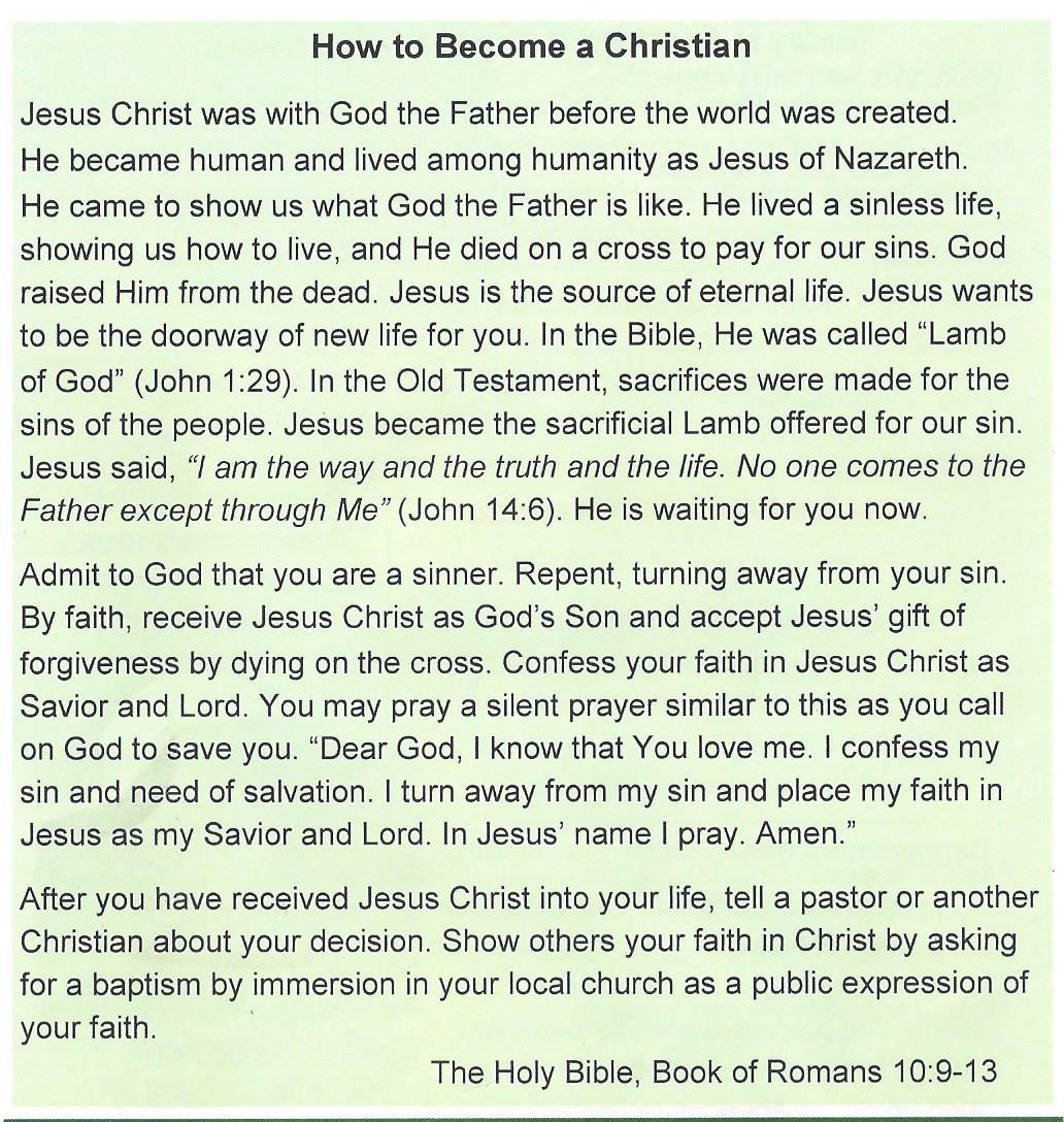 If you are still unsure about how to be saved and become a Christian, please reach out to us and we will be happy to pray with you and help you understand. Click here to contact us!